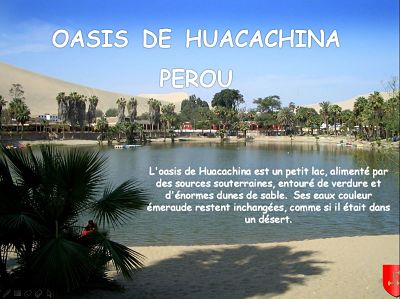 Huacachina est un village situé dans la région et province d’Ica, au Pérou, près de la cité d’Ica. En 1999, sa population était de 115 habitants. Le village est construit autour d’un petit lac, ce qui en fait la deuxième oasis du continent (après celle du village chilien de San Pedro de Atacama). Huacachina sert à la fois de lieu de villégiature pour les familles d’Ica ainsi que d’attraction touristique pour les étrangers désireux de venir admirer les dunes et pratiquer du sandboard1. La légende veut que l’oasis naquit lorsqu’une belle princesse indigène s’y réfugia pour échapper à un chasseur. La végétation se serait alors développée dès lors qu’elle serait entrée en contact avec l’eau, l’origine des dunes s’expliquant quant à elle par les marques de plis laissées par le manteau de la princesse. Des rumeurs continuent encore aujourd’hui à maintenir l’histoire selon laquelle la jeune femme serait devenue une sirène continuant à nager dans les eaux du lac2.