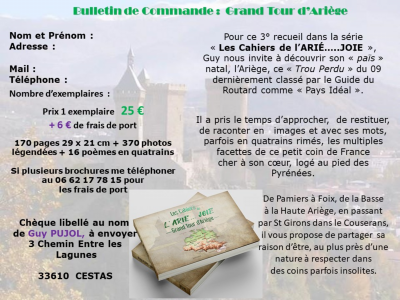 Intitulé « Grand Tour d’Ariège » vous pouvez commander ce recueil en utilisant le bon de commande ci-dessous :