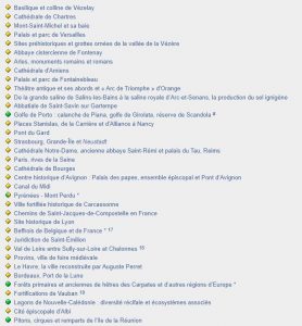 «Patrimoine Mondial de la France» un titre qui interpelle et nous paraît paradoxal. En fait il ne s’agit que de passer en revue les plus beaux sites français qui sont inscrits sur la liste du Patrimoine Mondial de l’Humanité ou de l’UNESCO. C’est selon ! Sur le début de la liste concernant la France, les points jaunes représentent des sites culturels, les points verts des sites naturels.