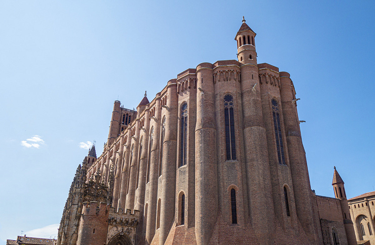 Vue de l’extérieur, Sainte-Cécile surprend. On est loin de la finesse ajourée des cathédrales gothiques du nord de la France. Ici, l’édifice ressemble à une forteresse, avec ses hauts murs lisses, ses contreforts massifs et son clocher-porche qui domine la ville.